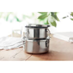 Készlet 2 darab rozsdamentes acél uzsonnás- vagy ételtároló dobozból, erős és biztonságos oldalsó csatokkal. Űrtartalom: 450 ml és 900 ml.