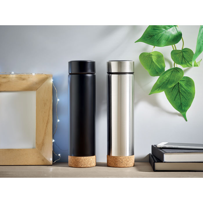 Duplafalú rozsdamentes acél termosz teaszűrővel, parafa aljjal. Űrtartalom 450 ml. Szivárgásmentes.